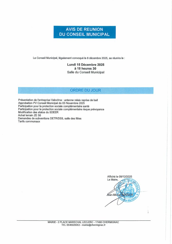 CONSEIL MUNICIPAL LUNDI 15 DECEMBRE 18H30Par Stéphane MERCIER / 12 décembre 2025 Facebook Twitter LinkedIn Email Imprimer
