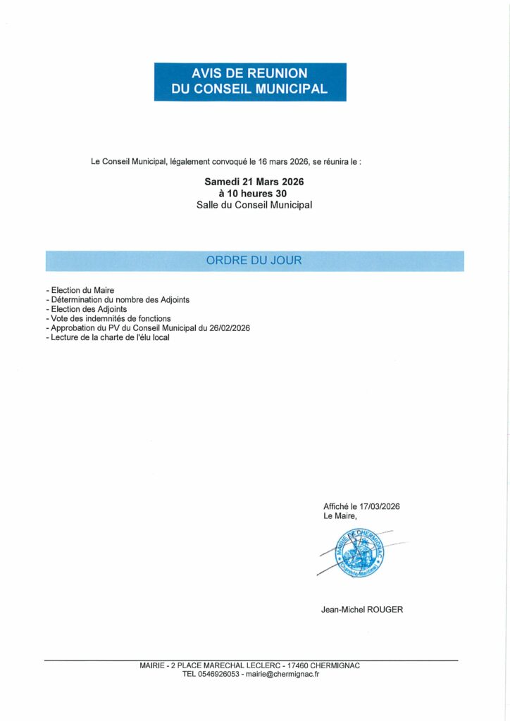 CONSEIL MUNICIPAL SAMEDI 21 MARS A 10H30Par Stéphane MERCIER / 17 mars 2026 Facebook Twitter LinkedIn Email Imprimer